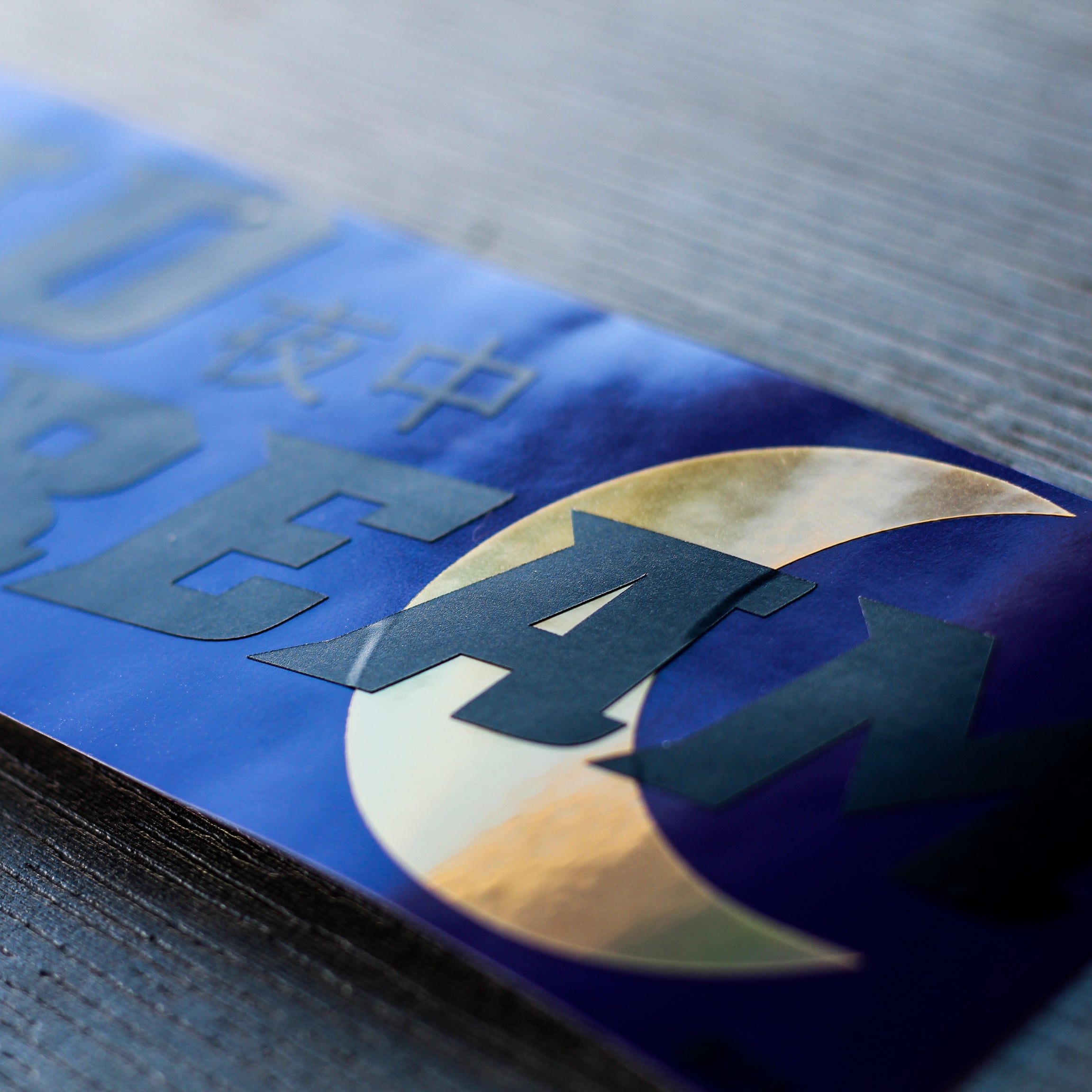 Finally our "Bad Dreams" limited Halloween slap featuring an indigo purple backing with matte black text and gold oilslick crescent moon for that amazing contrast. The Japanese text reads "Midnight" and "Terror"