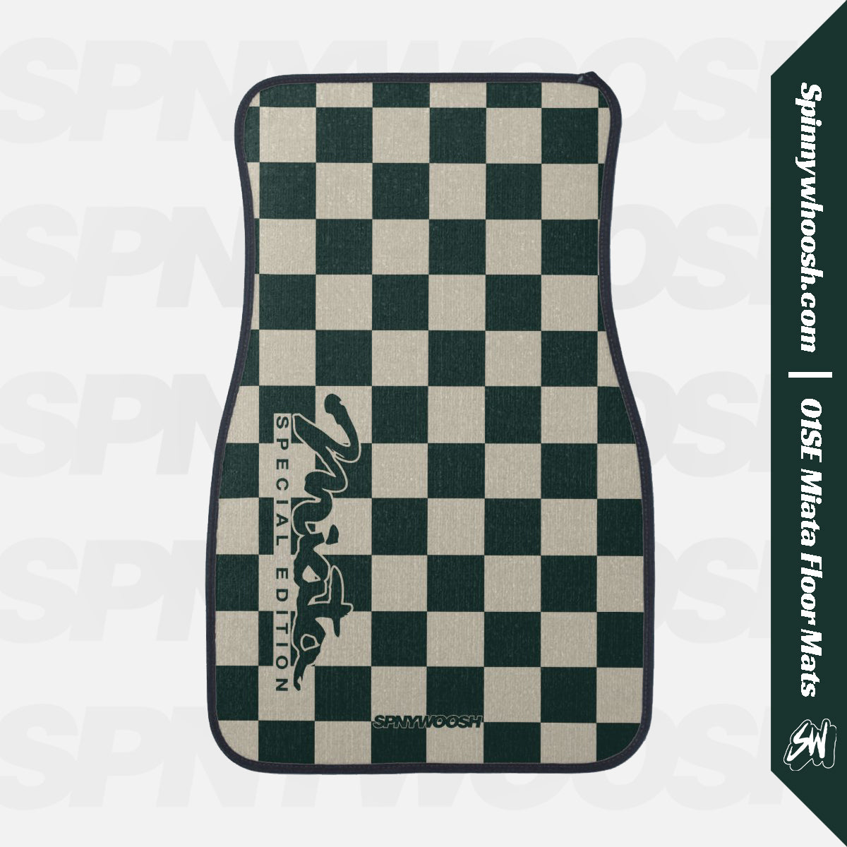Checkered floor mats specifically designed to match the 01 Special Edition NB Miata! We have taken the time to very accurately match the green of this design to the 01SE original British Racing Green Paint! This set will feature the Miata logo mirrored on each side to face correctly for each mat. Included is a set of two(2) floor mats and we will eventually offer options for both front + rear mats! These car floor mats are universal fitting and both sides are the same shape to fit RHD and LHD vehicles.