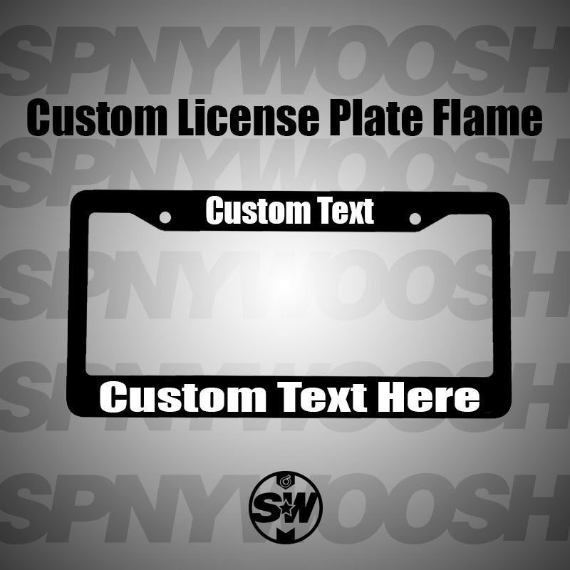 Custom License Plate Frame features a gloss black plastic frame with custom vinyl text decals at both the top and bottom of the frame. You can choose everything from color and font of the text.