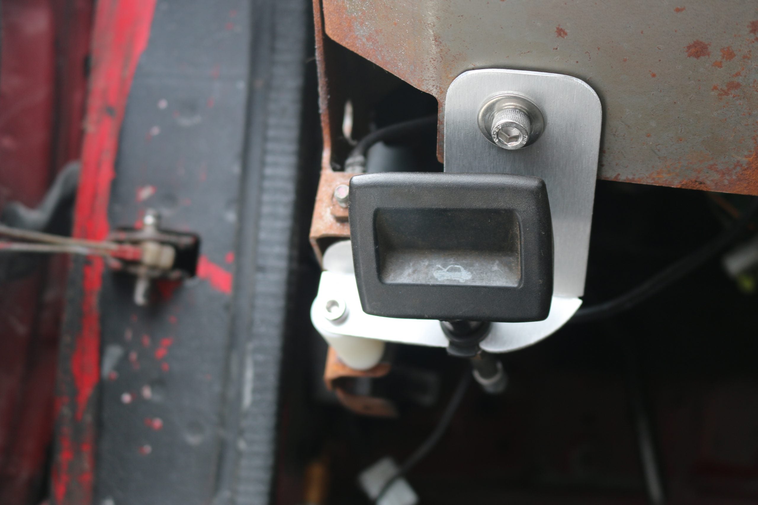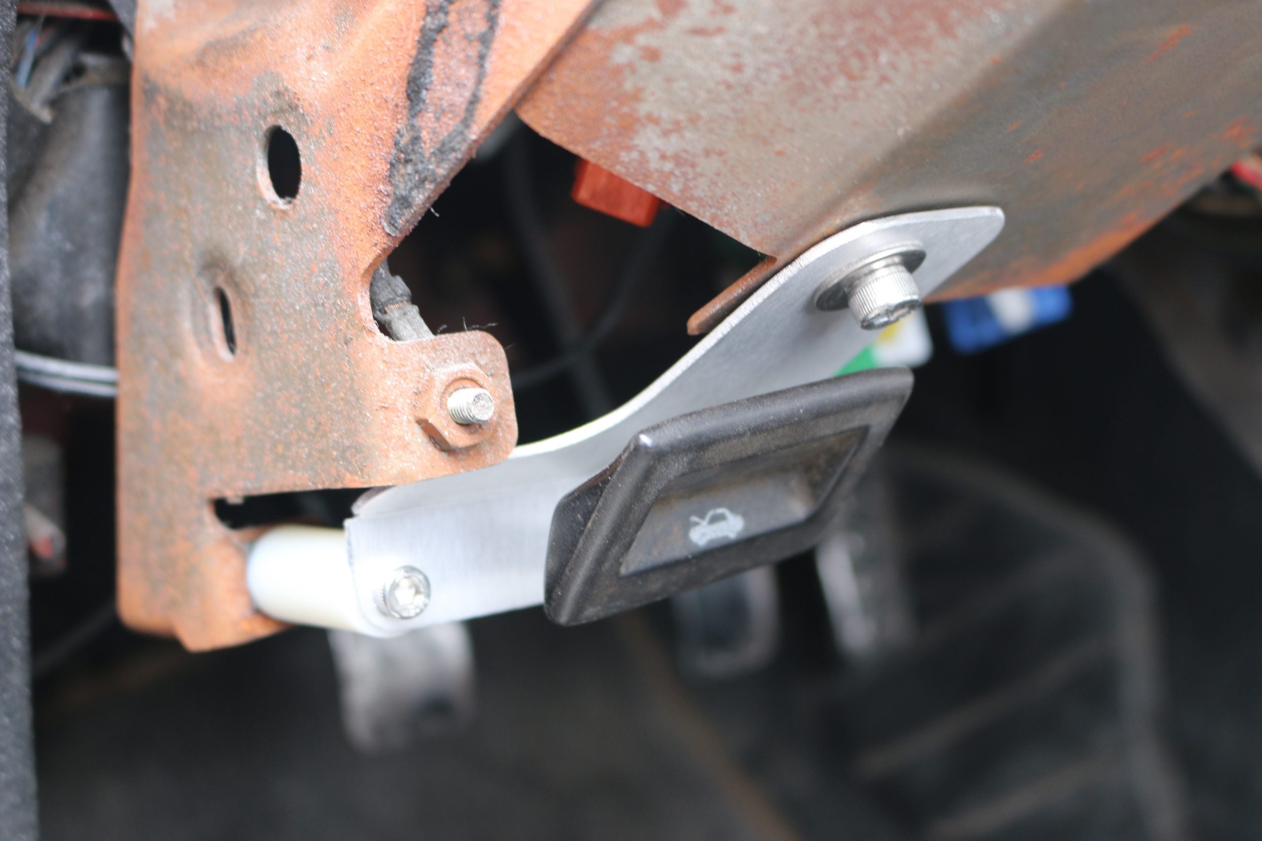 This is LRB Speed's hood release mounting bracket! Whether yours has broken, or you’ve removed/replaced your dashboard and no longer have a way to mount the hood release, this keeps it from dangling.
