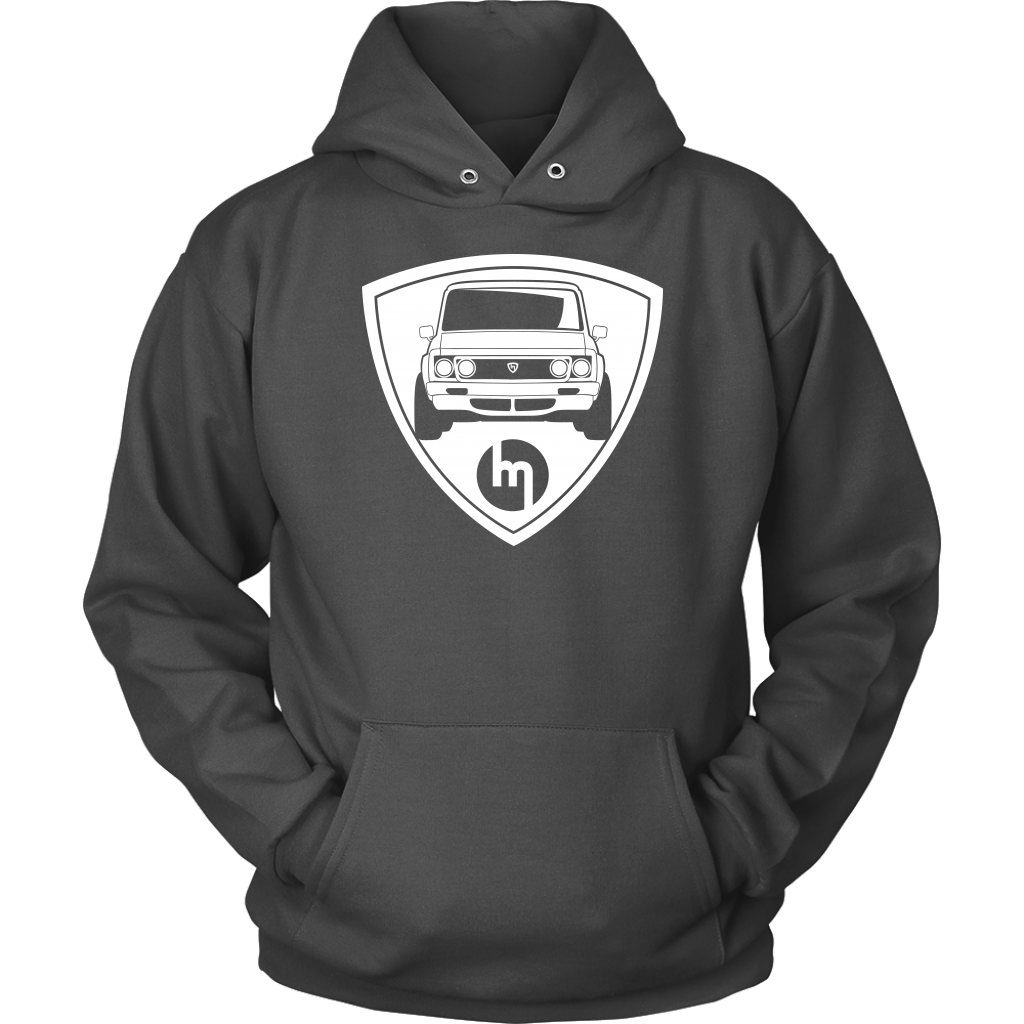 This Hoodie is part of our new Rotary collection featuring icon cars with the unique Wankel Rotary engine. The Rotary Pickup (REPU) was the world’s first and only Wankel-engined pickup truck. The REPU Truck was sold from 1974 to 1977 and appears to only have been available in the US and Canada. The Rotary-Engined Pickup (REPU) had a four-port 1.3-liter 13B four-barrel carbureted engine, flared fenders, a battery mounted under the bed, a different dash, a front grille, and round taillights. The Japanese text on the front reads “Rotary”.