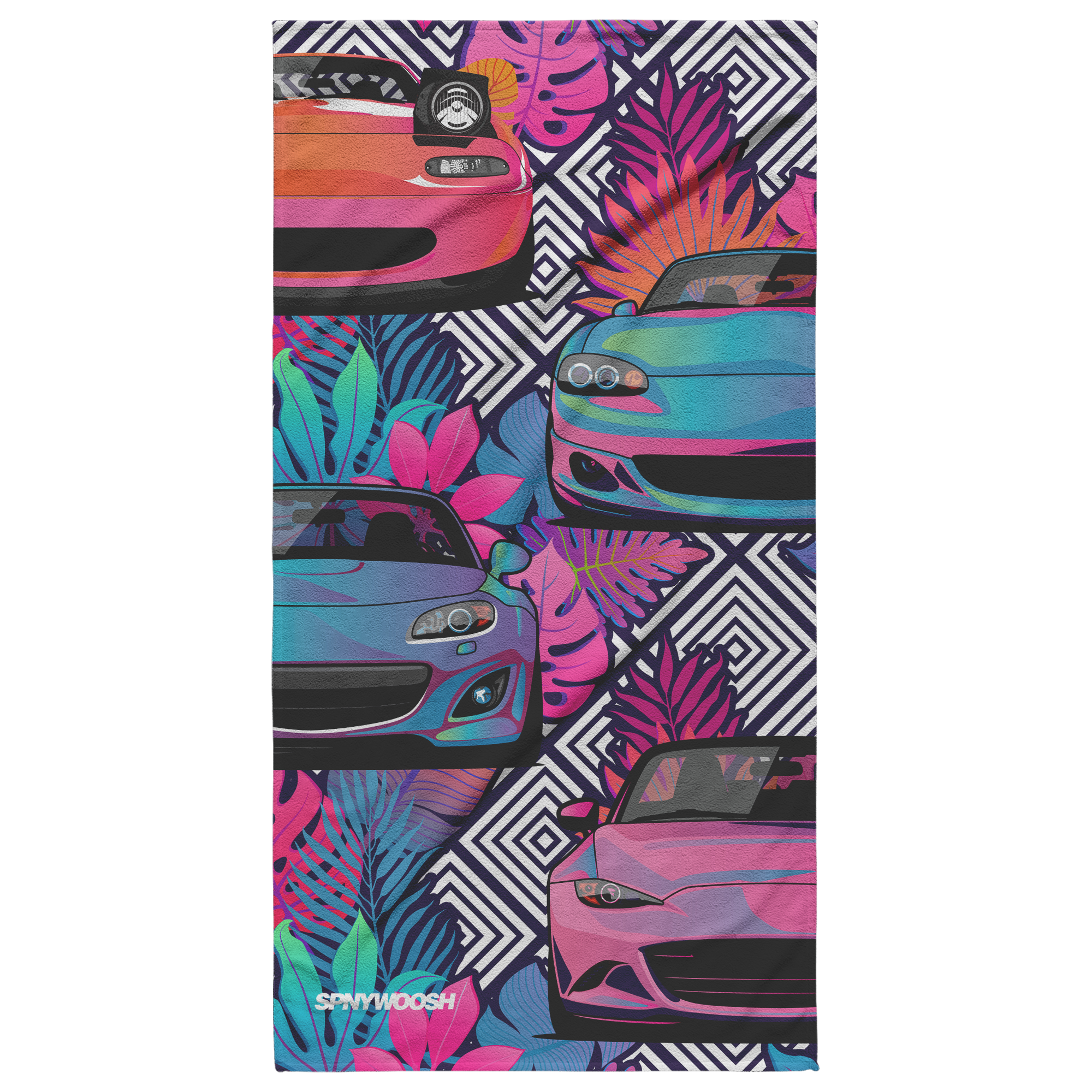 Bring bold energy to your summer adventures with the Miata Beach Towel – Neon Geo Floral. Featuring an electrifying mix of geometric patterns and neon floral accents wrapped around a clean Miata silhouette, this towel delivers a punch of retro-cool style with a modern twist.