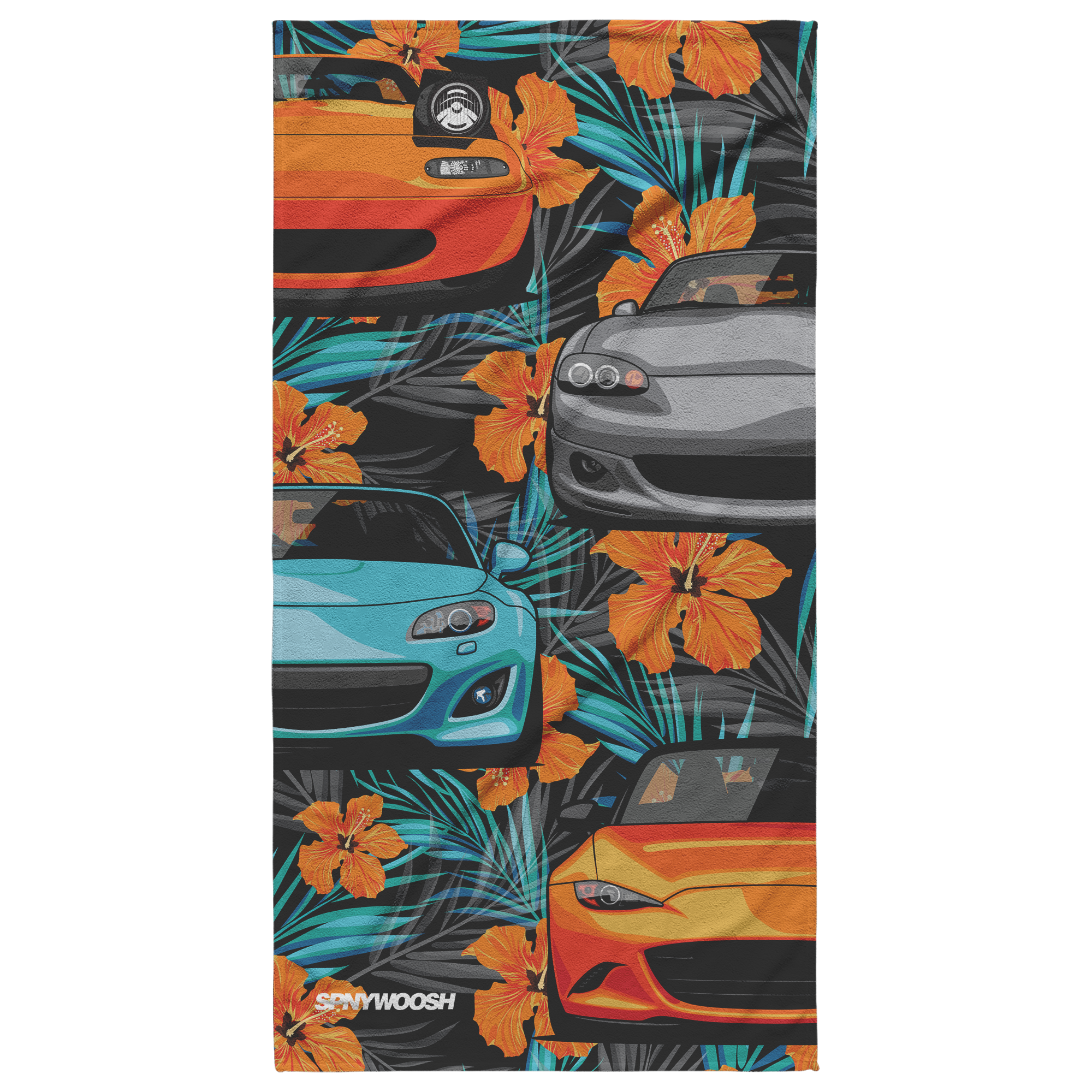 Turn heads at the beach with the Miata Beach Towel – Orange Hibiscus Floral, a bold blend of tropical flair and roadster pride. Showcasing vibrant orange hibiscus blooms and subtle palm accents wrapped around a sleek Miata silhouette, this towel is perfect for those who live life with the top down and the sun overhead.