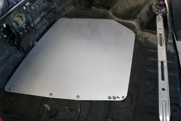 An aluminum replacement for the stock particle board spare tire cover that is almost always missing or damaged in S13s.