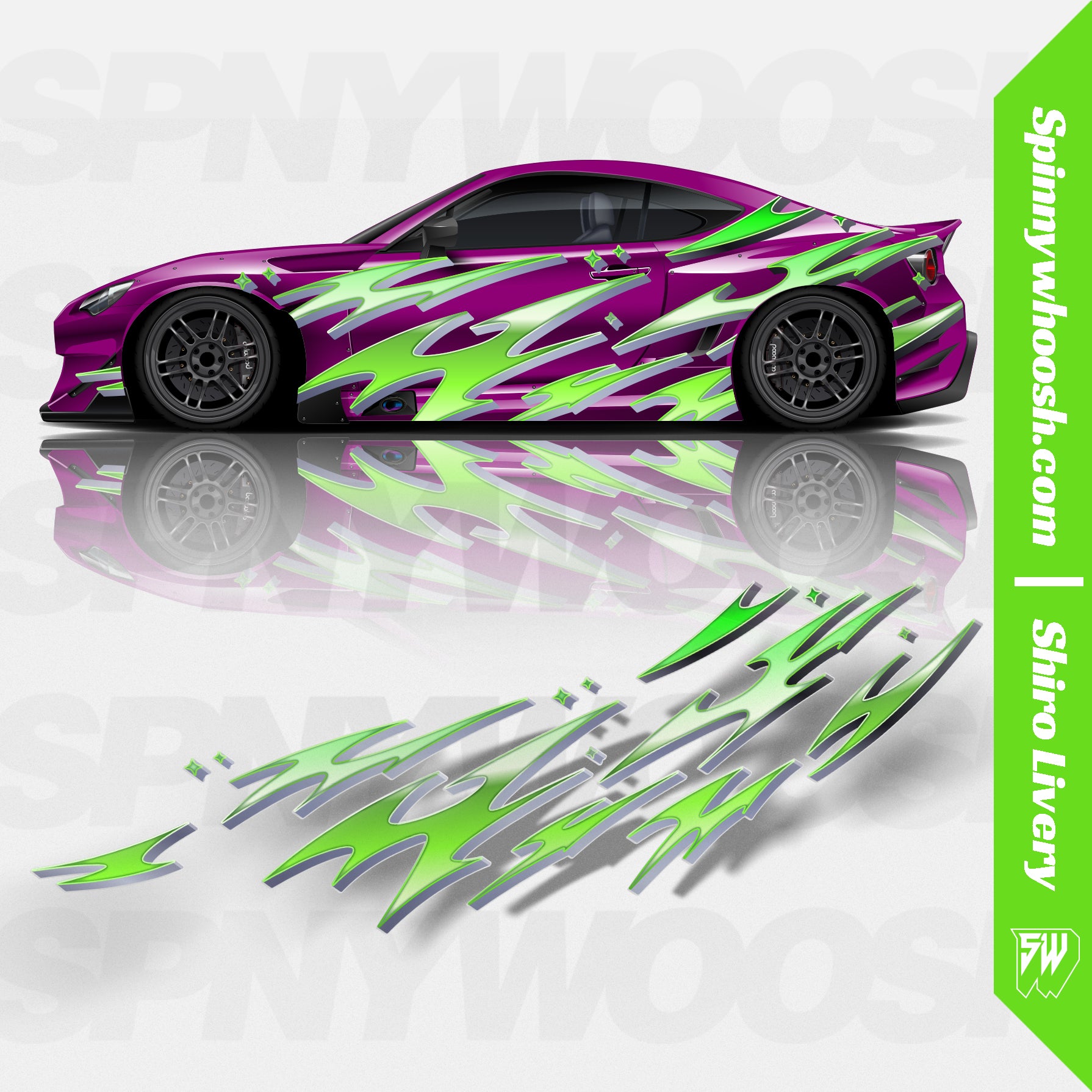 This is part of our Drift Livery lineup. This is a fully customizable Shiro livery (Shiro means White in English, which is named after the first car this livery was installed on) that is completely printed/cut to order. It includes full color printed decals for both sides of the car. We have also included a few add-on items as well! This drift livery set is guaranteed to last up to 3 years without cracking or fading.