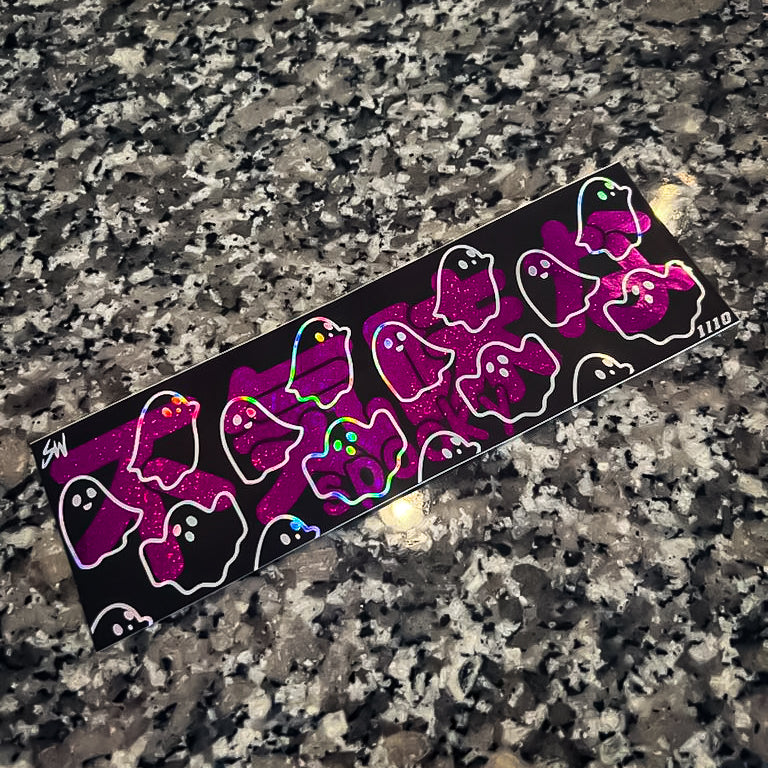 The fourth of our brand new limited Halloween slaps! This limited decal features ghosty outlines in silver oilslick, sparkle purple text and a matte black backing. The Japanese text simply reads "Spooky"!