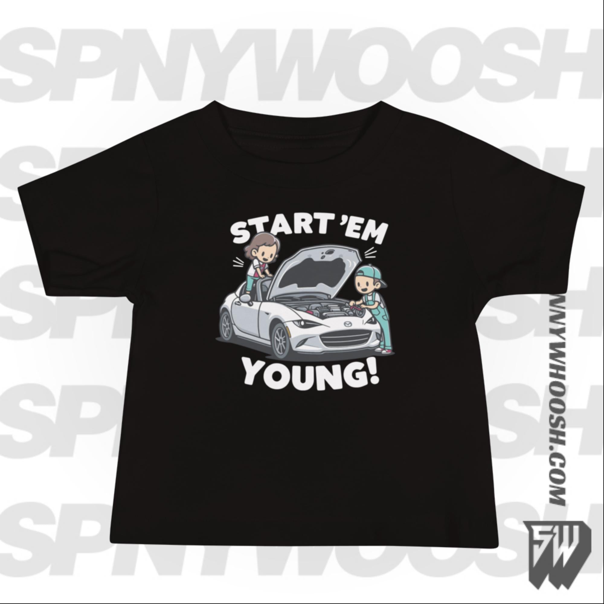 Introducing our “Start 'Em Young!” Baby Tee, a playful and spirited tribute to the next generation of car enthusiasts. 🚗🌟 Crafted with care, this design features two adorable children diligently tinkering with a sleek ND Mazda MX5.