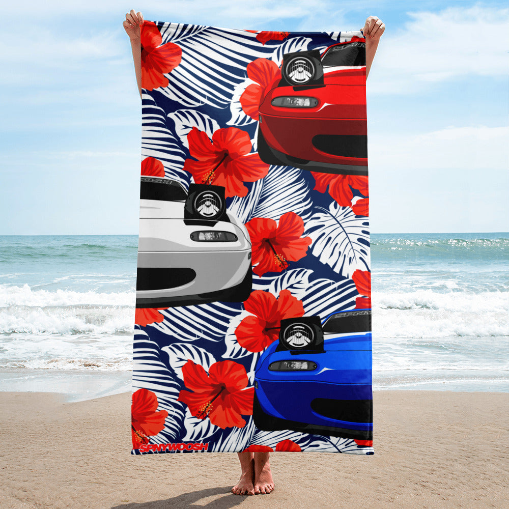 Part of our Summer Collection. Don't burn you ass on those leather seats again this summer, this vibrant beach towel is perfect for accompanying you in your Miata. They're great for the beach or as an outdoor throw blanket!