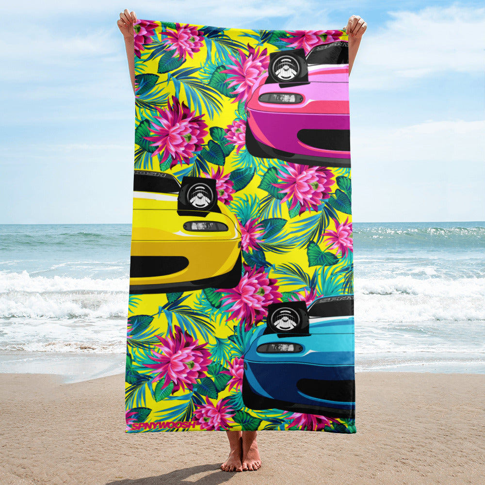 Part of our Summer Collection. Don't burn you ass on those leather seats again this summer, this vibrant beach towel is perfect for accompanying you in your Miata. They're great for the beach or as an outdoor throw blanket!